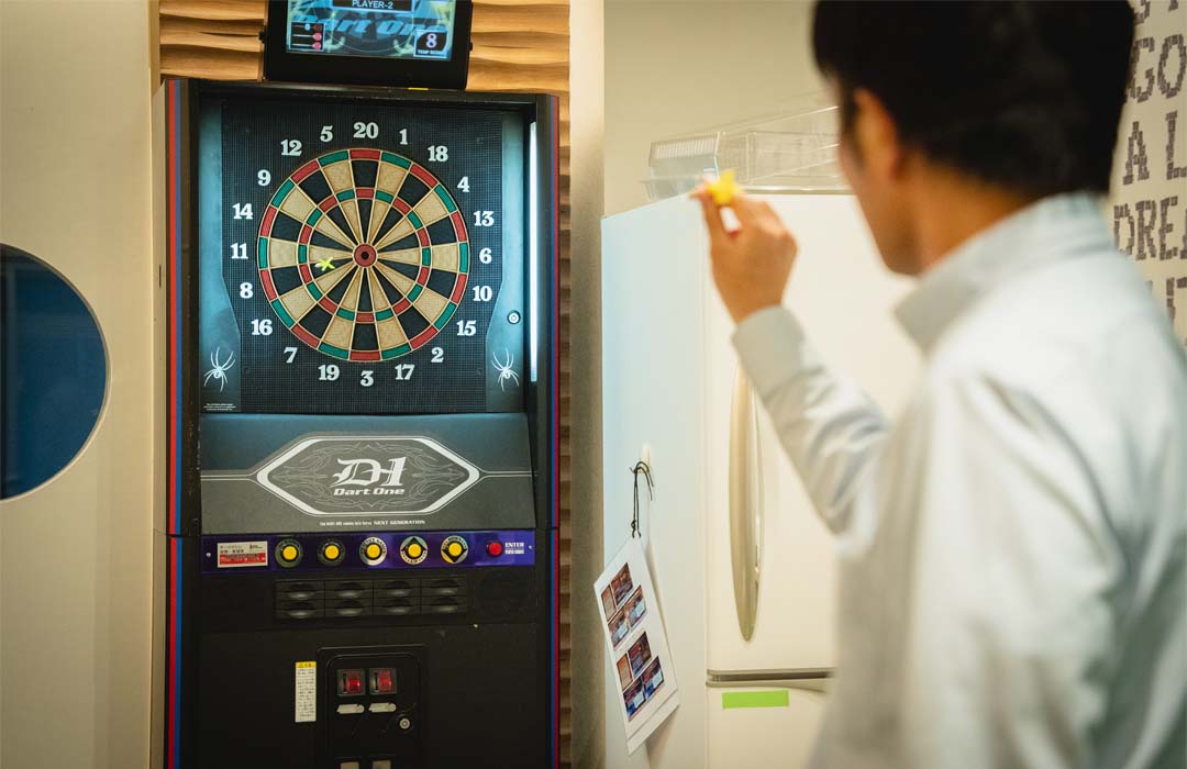 かつてのオフィスを改装した「マリモビレッジ」は社員のための福利厚生施設です。ゴルフのシミュレーターやダーツ、レーシングゲーム、カラオケなどを設置。社員同士でコミュニケーションを深めたり、取引先の接待もここで行うことができます。
